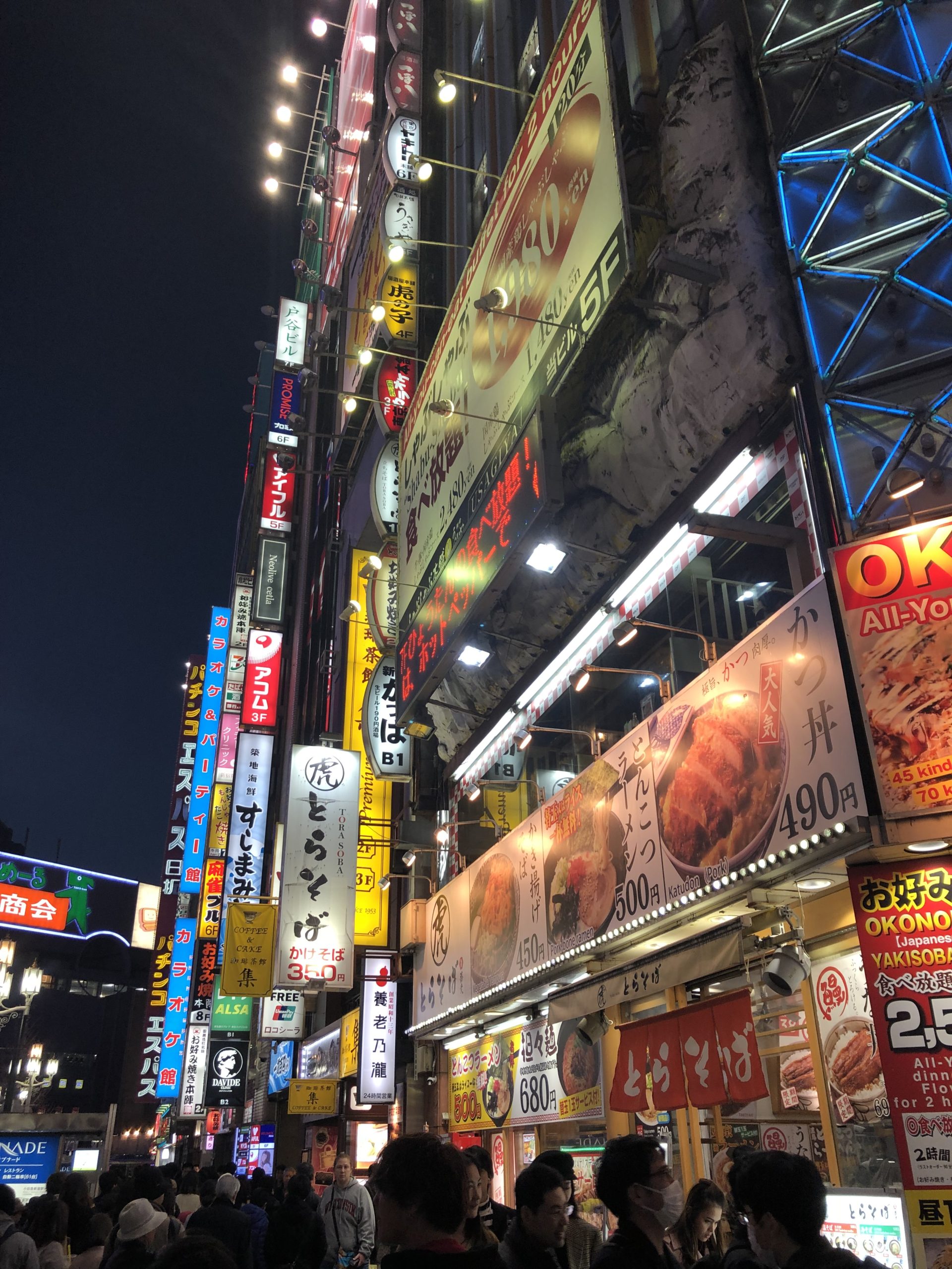 Nous quittons le magasin Donki à l’enseigne au pingouin pour nous rendre maintenant dans le cœur touristique de Shinjuku « kabuki-cho », quartier de l’amusement, nous passons devant les innombrables restaurants, karaoké, bar à hôtesse, salle de jeux vidéo et le cinéma de la Toho avec sa tête géante de Godzilla fixée au sommet du bâtiment, comme s’il s’apprêtait à déferler sur nous.